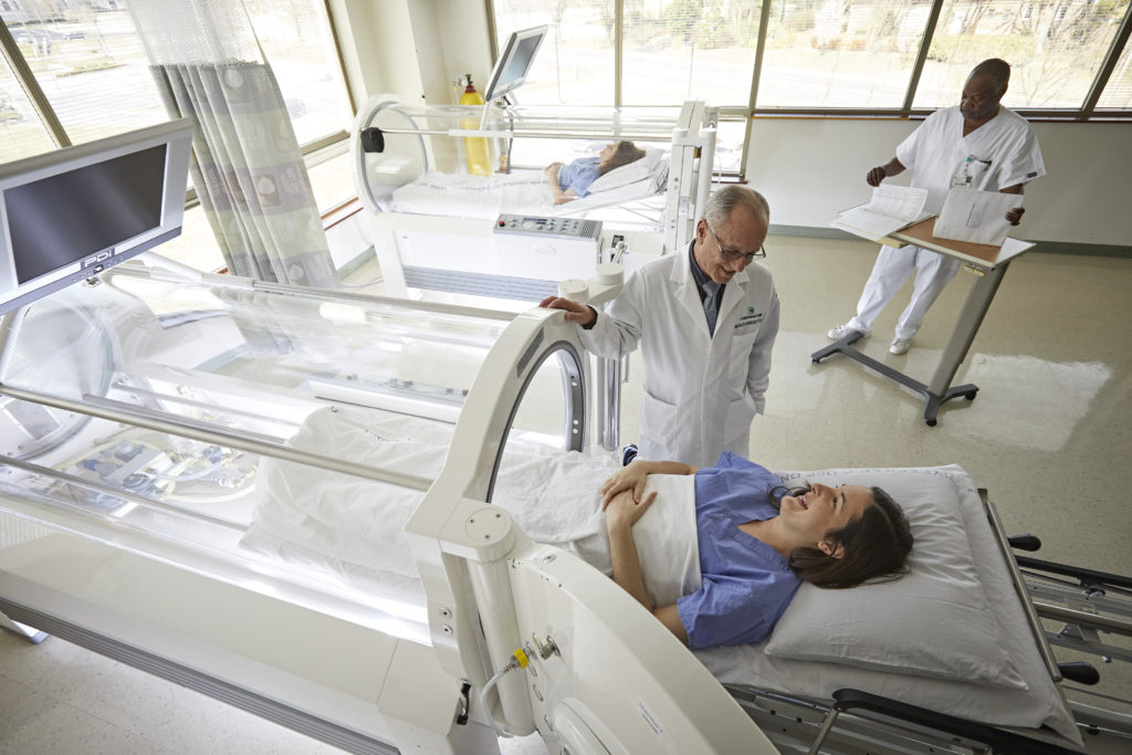 Hyperbaric wound treatment enhances tissue oxygenation and promotes healing in complex or infected wounds.